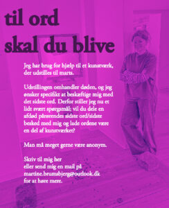 Jeg er kunstner og skal udstille i Aarhus til marts ifbm Aarhundredets Festival. Jeg har valgt at lave et værk, der hedder “Til ord skal du blive”. Værket omhandler det sidste ord, både det sidste ord vores pårørende siger, inden de dør, men også det sidste, vi siger til vores pårørende. For mange bliver de sidste ord enormt vigtige – det er i hvert fald min egen erfaring. Værket er en ode til de sidste ord, og selvom jeg selv har mistet både venner og familie til bl.a. selvmord og har nogle ord at bruge, så vil jeg gerne, at værket også kan repræsentere andres ord.